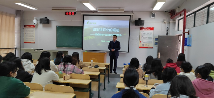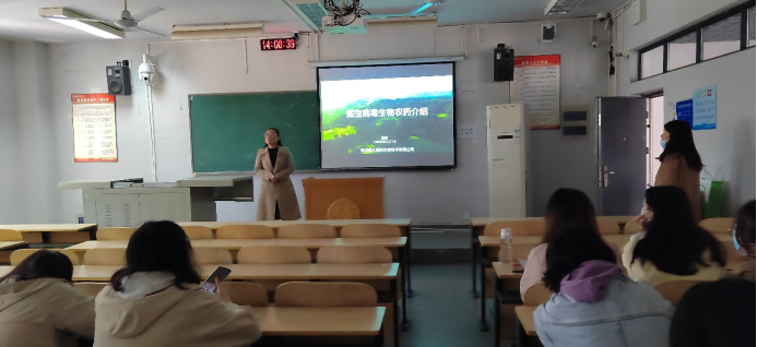武汉武大绿洲生物技术有限公司董事长林春鸿、绿色防控产业发展研究院副院长陈娇以及科普教育部陶佩文三位专家,结合现代生物技术和企业的科研生产管理现状,进行了“微生物农业的崛起-后疫情时代农业的发展趋势”“昆虫病毒生物农药介绍”“绿色防控体系建设”等精彩报告,并带来了企业产品“昆虫病毒杀蟑螂饵剂”“植物驱蚊喷剂蚊子拜拜”等,作为礼物送给同学们。每场报告都有精彩互动,同学们对感兴趣的产业发展现状、就业状况、核心技术、应用前景等,在课堂现场提问,专家都进行了详细解答,讲座现场气氛非常活跃。