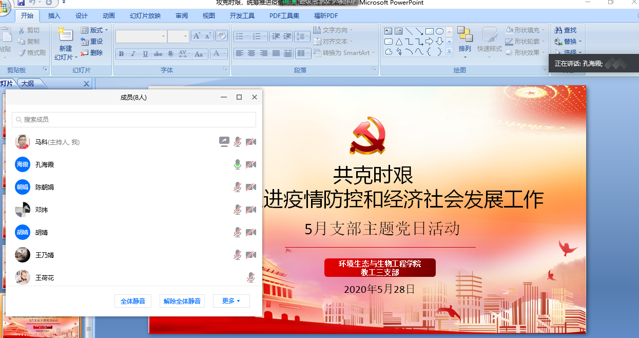 支部书记通过共享PPT领学了:习近平总书记在5月6日召开的中共中央政治局常务委员会会议上的讲话精神、习近平总书记在4月29日召开的中共中央政治局常务委员会会议上的讲话精神、习近平总书记在五四青年节对广大青年的寄语、湖北省近期召开的组织部长、宣传部长、统战部长会议精神、学校5月8日党风廉政建设工作会议精神。