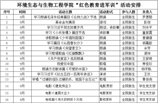 本次活动主要是在新生进行体能训练的间隙,将红色教育融入到大学生喜闻乐见的活动形式当中,让广大青年在体能训练中磨炼意志、锤炼品格的同时,在思想上得到进一步的升华,坚定理想信念。活动分为三个部分“红色经典篇章诵读”、“红色歌曲传唱”、“红色电影欣赏”,全部由学院学生党员骨干带领新生开展完成。