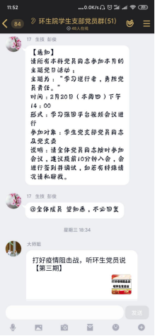 首先,由彭俊同志带领大家学习了《环生院致全体学生党员倡议书》,并倡议广大学生党员争做疫情防护的宣传者、科学防护的践行者、疫情防护的志愿者、特殊时期的理性奋斗者,充分发挥学生党员在疫情防控工作排头兵的作用。
