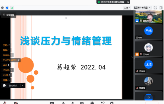 本网讯(通讯员 王乃婧)为普及心理健康知识、提高学生心理调适能力、促进学生以最佳的状态面对学习和生活,大红鹰会员登录中心开展了大学生心理健康教育专题讲座,讲座邀请国家二级心理咨询师、浙江大学医学博士、校心理健康教育中心兼职教师葛超荣老师为学生开展《浅谈压力与情绪管理》的专题讲座,学院300余本科生、研究生通过线上和线下的形式参加了本次活动。