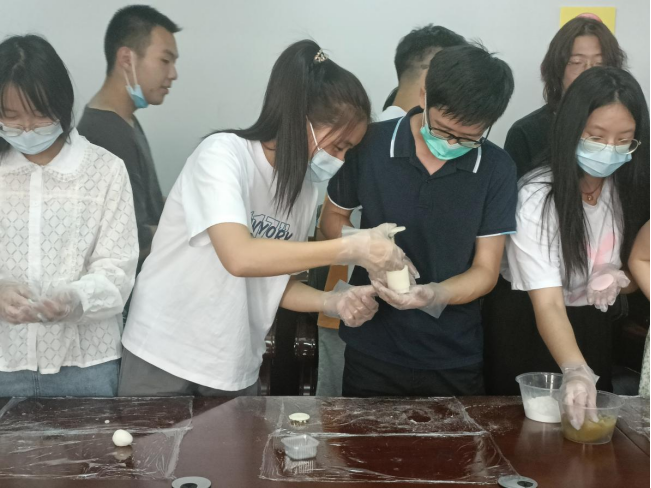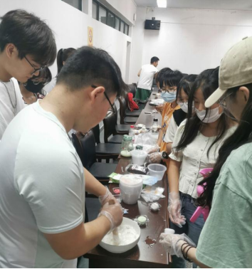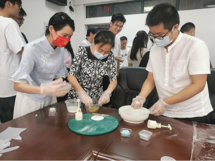制作月饼环节更是热闹非凡,师生根据视频教程,一起从饼皮做起,揉面、擀面、包馅、压制、脱模,共同制作了许多精致可爱的冰皮月饼。活动现场月饼飘香,师生有说有笑,互道双节快乐。