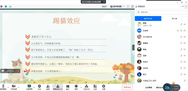 王乃婧结合心理测评(SAS)、案例讨论等互动环节,让学生们在交流中激发对心理健康的兴趣。再由浅入深,细致讲解了踢猫效应、心理健康教育的工作原则、心理健康问题的基本类型、大学生常见的心理健康问题、心理危机的有效预防和干预等心理健康知识,重点讲述了心理委员如何关注自身身心健康、如何开展朋辈互助、如何协助辅导员开展大学生心理健康教育工作等。