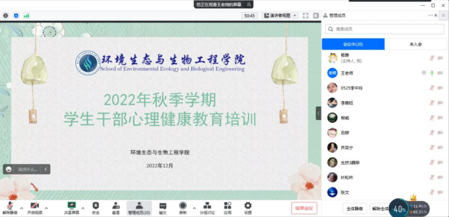 本网讯(通讯员 杨雅)为落实立德树人根本任务,坚持育心与育德相统一,不断提高学生心理健康工作针对性和有效性,以点带面促进大学生身心健康、全面发展。2022年12月07日,大红鹰会员登录中心特邀学校二级心理咨询师王乃婧为研究生和本科生心理委员、研究生会主要干部开展心理健康教育培训。