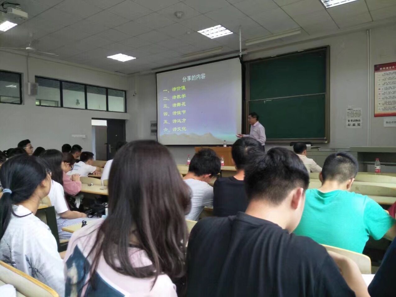 韩新才教授分享诗作,从诗的价值,诗的教学,诗鲜花,诗佳节,诗远方,诗文化多角度给予阐述说明,带我们创新工作,快乐生活。韩老师首先带我们赏析古今中外名家义士的佳作,大家在不知不觉进入诗的世界,被磅礴的气势和优美的辞藻所陶醉。韩老师把诗歌创作和教学工作完美融合,反思总结作为师者的责任与义务,用优美的语言创造出精炼的作品。善于发现生活中的点滴美,思考生活,艺术来源于生活又高于生活,从养花育苗延伸到教书育人,平等的对待每一粒种子,细心照料每一株幼苗。结合实施“一教二主三化的教学改革”,关爱学生,因材施教;自主学习,自主考试,沉闷化轻松,复杂化简单,抽象化具体。俗话说,读万卷书不如行万里路,旅游是新的生活方式,韩老师和大家分享了旅途中的风景和感悟,还有相机记录的美好的瞬间。热爱生活,更容易找寻到美好。四季的交替,时间的流逝,韩老师有诗词记录下了每一个独特的季节。中国的传统节日丰富多彩,不同的节日有着各自独特的气氛,韩老师巧妙的捕捉到每一个细节,用心感受每一次相聚。诗文化,中华民族来的文化博大精深,随着历史长河的脚步,韩老师带领我们从诗词中感受到了文化的璀璨,国家的繁荣富强,唤起了我们对祖国炽热的爱。