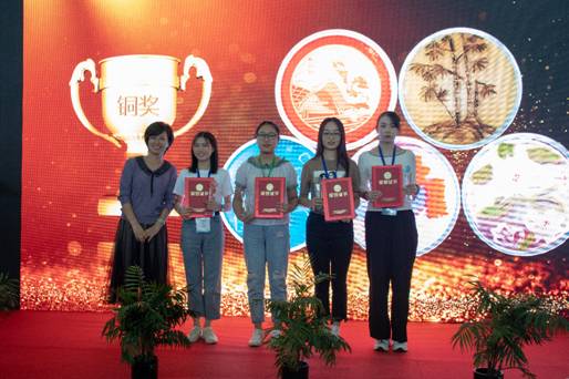 青岛高科技工业园海博生物技术有限公司(协办单位)副总经理吴辞萍为铜奖颁奖,李倩妮同学(左二)代表获奖队伍领奖