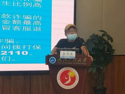 保卫处安全教育宣讲团成员余华兵结合诈骗实际案例与数据、生动有趣的视频,警示新生注意防范诈骗,时刻将反诈意识牢刻在心中。