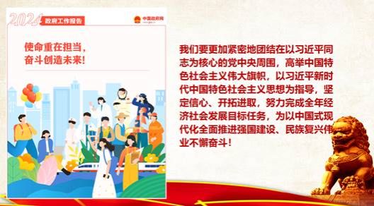 会上,郑冬洁从2023年工作回顾、2024年发展主要预期目标、2024年政府工作任务等方面带领学习了2024政府工作报告,希望同学们志存高远、脚踏实地,把课堂学习和国家发展紧密结合起来,练就过硬本领,为实现中华民族伟大复兴作出应有贡献。同时就学生党建工作提出要求:一是提高政治站位,改进工作作风,各支部要求实效、重实干,树新风、展新貌,以身教作执行的榜样,为全院学生树立改进作风、狠抓落实的典范,发挥“头雁效应”。二是加强支部标准化、规范化建设,落实基层党建工作责任制,严守党员发展纪律、严格坚持发展标准、严肃履行入党手续。三是加强学生党员队伍建设,严把党员发展质量,要加强对入党积极分子的培养,深入推进党员示范岗挂牌、党员示范寝室创建和党员宿舍导师制,充分发挥党员模范带头作用。四是要激发支部活力,打造“一支部一特色”的党建品牌。高标准完成“规定动作”,高质量完成“自选动作”,创新主题党日活动形式,不断丰富活动内容,让主题党日“活”起来。